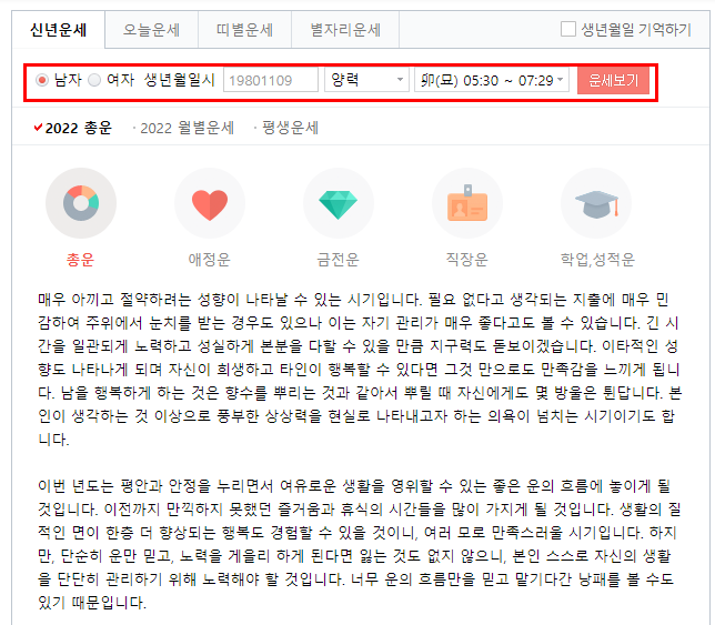 기본정보를 입력하고 운세 이용하기 버튼을 눌러주면 2022년 신년운세 무료 정보가 나옵니다.