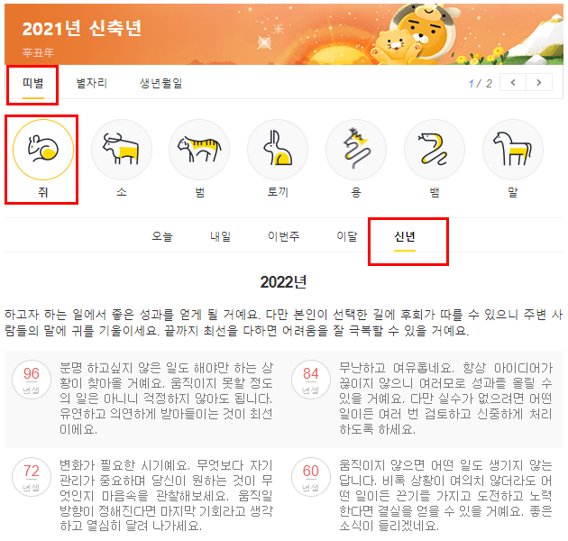 이렇게 본인의 띠를 선택하고 신년 메뉴를 선택후 년생에 맞는 운세 정보를 보면 2022년 신년 운세를 무료로 확인할 수 있습니다.