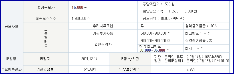 일반청약자 공모와 기관투자자, 우리사주조합 공모를 모두 합친 전체 청약 금액은 180억 원 규모가 됩니다.
