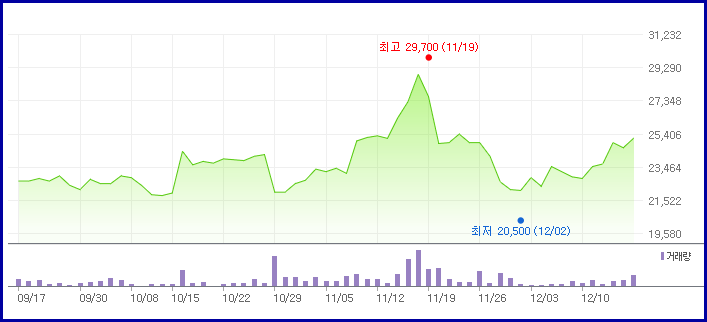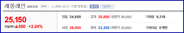 코넥스시장에서 래몽래인 주가는 2만원대를 오가고 있는 상황입니다. 지난 11월 19일에는 최고가인 29,700원을 기록한 적이 있습니다. 12월 17일 금요일 기준 주가는 25,150원입니다.
