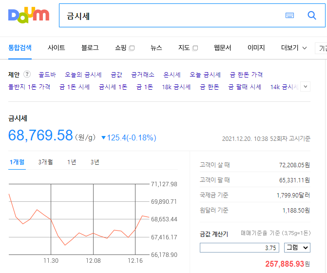 오늘 2021년 12월 20일 오전을 기준으로 금시세는 g당 68,769원 입니다 전일대비 0.18%가 감소하였고 124.4원이 내린 금액입니다.